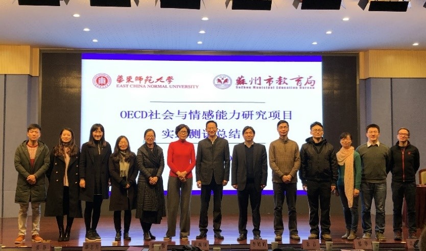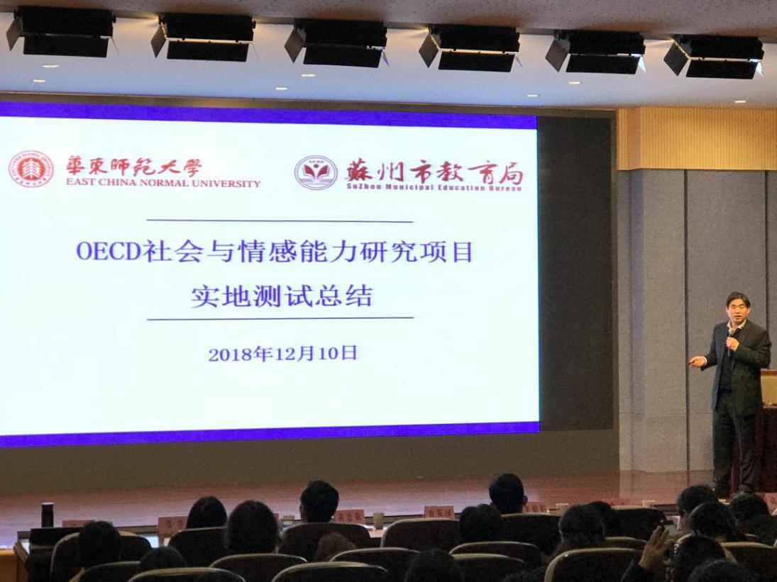 2018年12月10日,OECD社会与情感能力项目第一阶段实地测试总结研讨会在苏州市教师发展中心报告厅顺利召开。华东师范大学教育学部主任袁振国教授,教育学系主任黄忠敬教授,心理学院邵志芳副教授等专家团队成员一行11人参加了此次总结研讨会。苏州教育局李婧娟副局长、德育处徐洁处长,各市、区教育局“社会和情感能力”项目的分管领导、直属学校分管校长和主任和各市、区测试主任和抽样学校协调员等共一百五十余人参加了活动。总结会由苏州市教育局德育处徐洁处长主持。