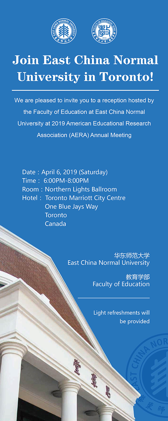 华东师范大学教育学部将在2019AERA年会期间召开学术交流会,诚挚邀请海内外校友、同事、朋友参加!时间:2019年4月6日(周六)晚6:00-8:00,地点:加拿大多伦多万豪酒店 Toronto Marriott City Centre, Northern Lights Ballroom