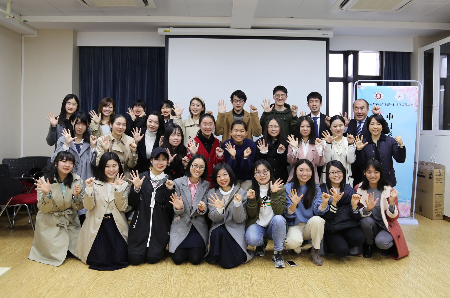在教师交流的同时,学习院大学代表团的9位学生也和教育学部的学生在久保田福美老师的带领下开展了“一对一游戏”交流活动。同学们积极互动,意犹未尽。