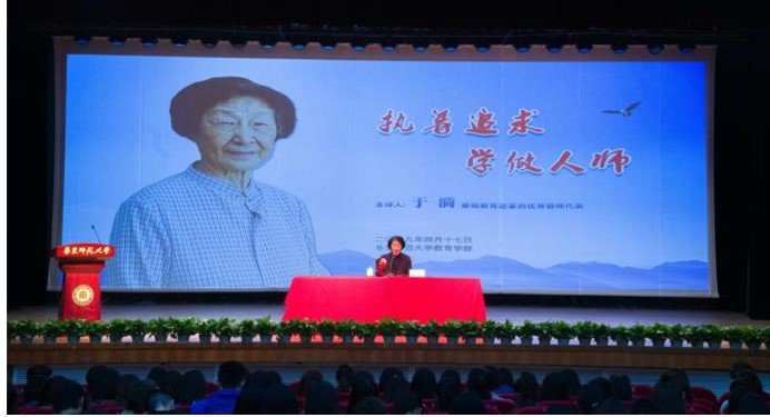 教育是国之大计、党之大计。人民教师无上光荣,每个教师都要珍惜这份光荣,爱惜这份职业,严格要求自己,不断完善自己。这既是党和国家对广大人民教师的充分肯定,也是新时代的希望与重托。为传承教育初心,涵养师者情怀,2019年4月17日下午,华东师范大学中北校区思群堂内,已是耄耋之年的中国基础教育改革优秀教师代表,荣获”改革先锋”称号的于漪老师,以中国改革开放的亲历者和参与者的视角,向800余名师生讲述”何为执着追求,如何学做人师”。华东师范师范大学副校长戴立益教授担任报告会主持人。