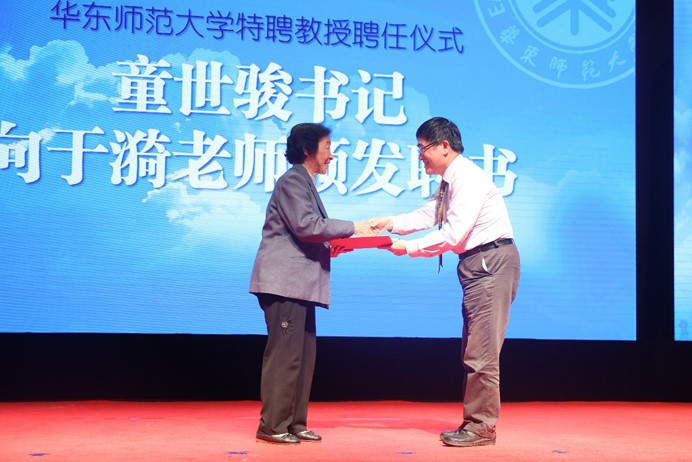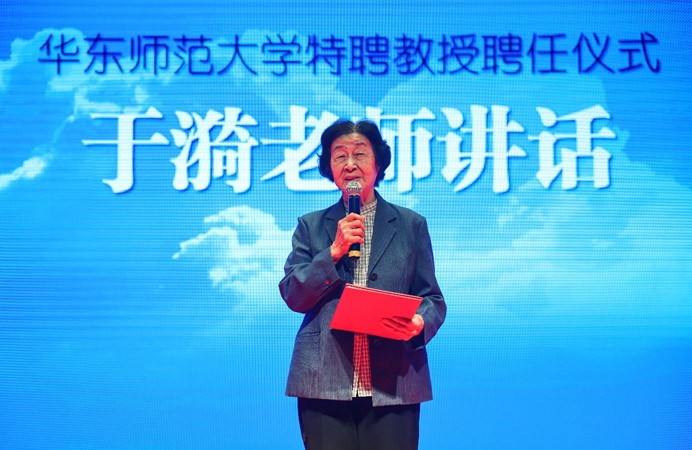 童世骏代表学校向于漪颁发了华东师范大学荣誉教授聘书。戴立益在致辞中介绍了于漪在中国基础教育改革道路上所做的令人敬佩的贡献,指出她是点亮学生心灵的燃灯者,践行以人为本理念的先行者,教书育人的垂范者,是值得全体教师学习的时代楷模。他还讲述了于漪教授与华东师大的深厚学缘关系,表示本次授聘的意义不仅在于进一步延续和加深这层学缘,更在于为华东师大的青年学子树立一个师德师风的楷模,人生发展的标杆。
