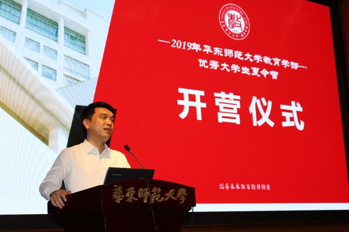 教育学部主任袁振国教授出席仪式并讲话。“教育学是一门有温度的科学。教育学部就是要实现充满温度的科学的教学,在培养人、教育人的过程中,不仅要充满思想、充满诗情画意,还要坚持科学和真理。”袁主任旁征博引地与同学们分享了个人对于教育学的理解与见地,并且介绍了华东师大教育学部的育人目标和特色。如何可以成为“来教育的引领者”未呢?袁主任叮嘱同学要在四个方面上下足功夫:1.坚持正确的理念方向;2.建立合理的思维方法;3.理论联系实际;4.注重国际化。最后,袁主任热情地欢迎营员们加入教育学部,在学部收获事业成功和人生幸福的平衡状态,共同努力开辟祖国教育事业的未来!