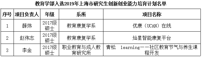 近日,上海市大学生科技创业基金会公布了入选2019年上海市研究生创新创业能力培育计划的名单。我校共有7个研究生创业项目入选,其中,教育学部入选3个。
