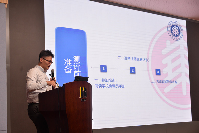 郭家俊博士依据《学校协调员手册》作了细致的测评前准备讲解。首先对最近需准备的师生联络表的填写规范、表格时间节点进行详细说明,进而对接收站点资料清单、建议测评日期、与测试主任合作等事项进行说明。