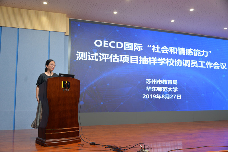 2019年8月27日,OECD社会与情感能力研究项目学校协调员培训会在苏州市教育局综合楼4楼会议室召开。华东师范大学教育学系主任黄忠敬教授、华东师范大学心理学系邵志芳副教授等专家团队成员、苏州市教育局政宣处处长徐洁以及正式测评涉及学校的全体协调员参加了培训会。培训会由苏州市教育局张雨作老师主持。