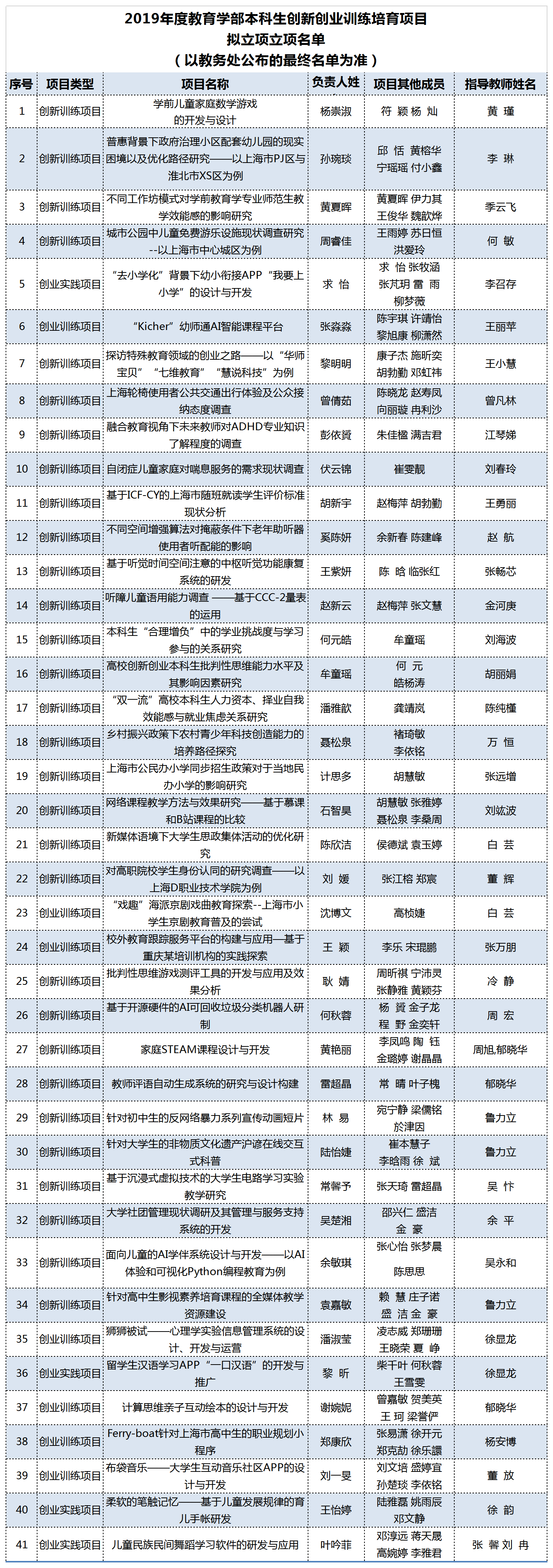 结合本科专业众多且学科跨度较大的实际,教育学部在参照去年各本科专业双创立项基数上,按照本科专业分别进行立项答辩,学部层面进行材料审核的方式开展立项评审工作。据悉,今年教育学部本科生对申报双创课题的积极性较往年有了大幅提升,共有63个课题小组进行申报,同比去年增长43.2%。其中,41个小组通过立项答辩和材料评审,获得拟立项资格,项目信息如下:
