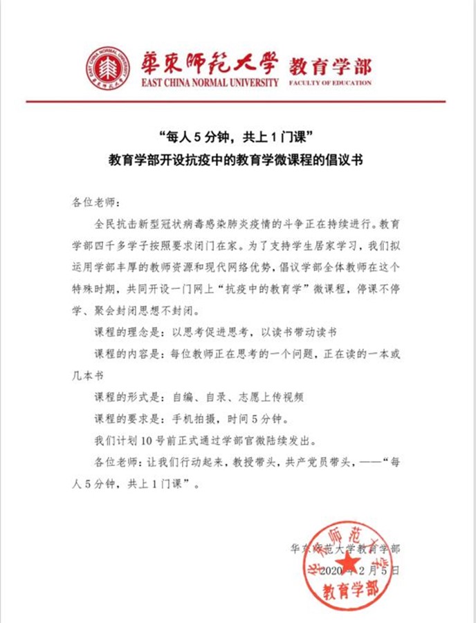 在全民抗击新型冠状病毒感染肺炎疫情最为艰巨的时刻,为了帮助同学们在抗疫”宅家”期间更好地开展自主学习,教育学部于2月5日向学部所有老师发出倡议,运用学部丰厚的教师资源和现代网络优势,”每人5分钟,共上一门课”,开设网上”抗疫中的教育学”微课程。倡议发出之后,得到了学部老师的热烈响应,总共90多位老师报名参加,提交了视频。在经过紧张制作之后,”抗疫中的教育学”系列课程的第一期,于倡议书发出后的第三天,也是2月8号元宵节这天,顺利推出。视频课程一经发布,就受到广大师生热烈欢迎,在短短几天内,第一期两个视频的总点击量就超过10万+。