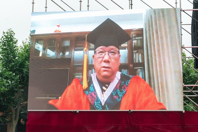 在全场的掌声和期许中,袁振国主任上台为毕业生们上”最后一课”。他首先向毕业生们表示祝贺。他说,同学们在新冠肺炎疫情战争中经历了更多磨砺,也实现了更多绽放。对于本届毕业生入学以来取得的进步和成绩,尤其是为抗疫作出的大大小小的贡献,袁主任如数家珍、娓娓道来,表达了作为师长的自豪和骄傲,也由衷地为同学们点赞。