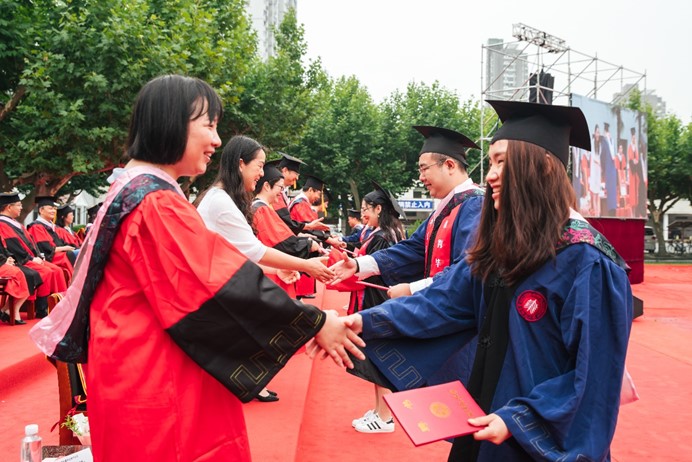 全场奏唱国歌之后,典礼正式拉开序幕。首先便是优秀毕业生表彰环节,学部领导、教授代表为47名上海市优秀毕业生和51名华东师范大学优秀毕业生颁发证书。陆续上台的毕业生们也得到了台下师生的阵阵掌声,在榜样引领、同辈共勉的过程中,典礼气氛很快便进入了高潮。