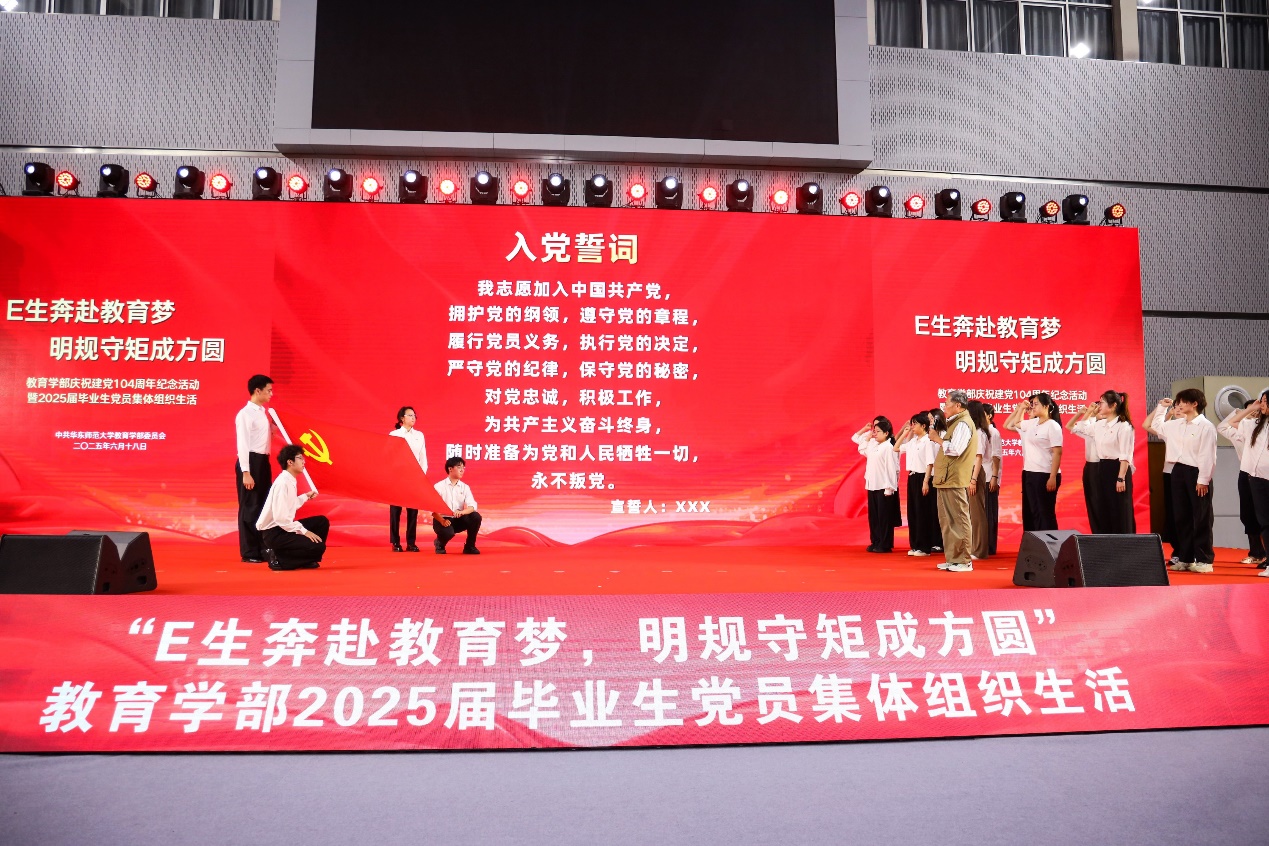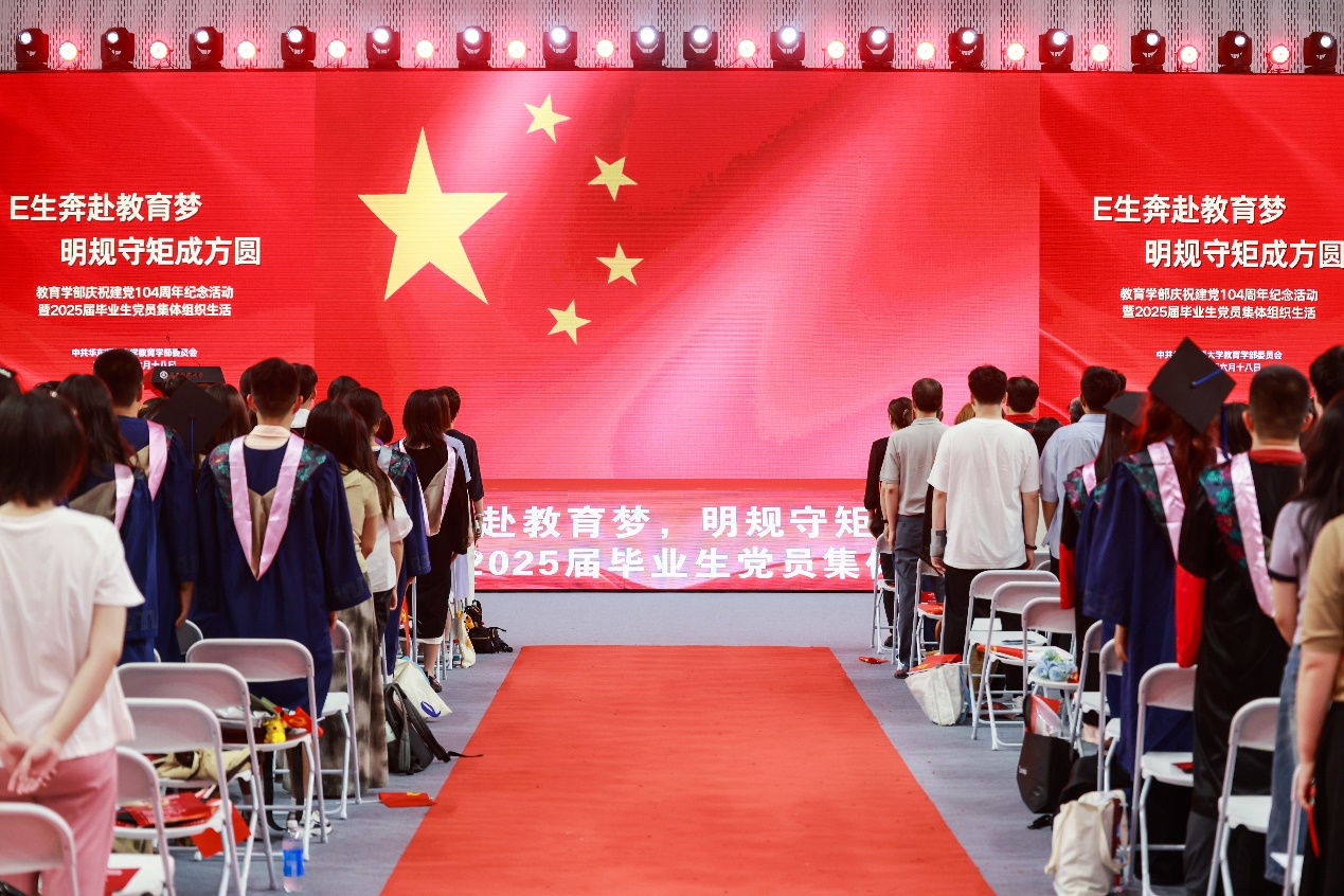 2025年6月18日下午,为进一步学习践行习近平总书记关于加强党的作风建设的重要论述,扎实推进深入贯彻中央八项规定精神学习教育,加强师生党员理想信念教育,教育学部举办“E生奔赴教育梦 明规守矩成方圆”庆祝建党104周年大会暨2025届毕业生党员集体组织生活,通过专题党课、荣誉表彰、榜样访谈、共画“青莲”等形式,教育引导师生党员强党性、正党风、严党纪。