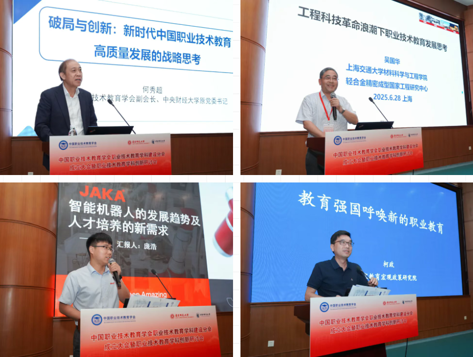 会议期间,职教学会副会长何秀超,上海交通大学特聘教授、轻合金精密成型国家工程研究中心副主任、航天先进材料与应用技术联合实验室主任吴国华,节卡机器人股份有限公司教育事业部资深专家庞浩,华东师范大学发展规划部部长兼重点建设办公室主任、国家教育宏观政策研究院执行院长柯政等专家作了学术报告。