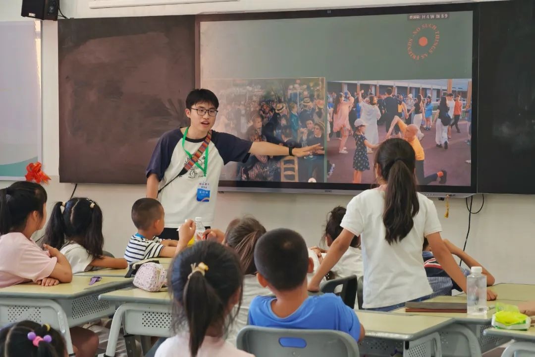 教育学部“七彩童年·智绘未来”彩虹夏令营在同一小学开启,8位队员开设创意编程、心理剧场、AI绘画、音乐赏析等课程,80多名孩子在“做中学”里成长。曾在线上支教的24级学前教育学系的周秦羽,今年作为带队队长站在孩子们面前:“他们记得两年前的‘故事地图’,现在又跟着学AI绘画——这是教育最动人的双向奔赴。