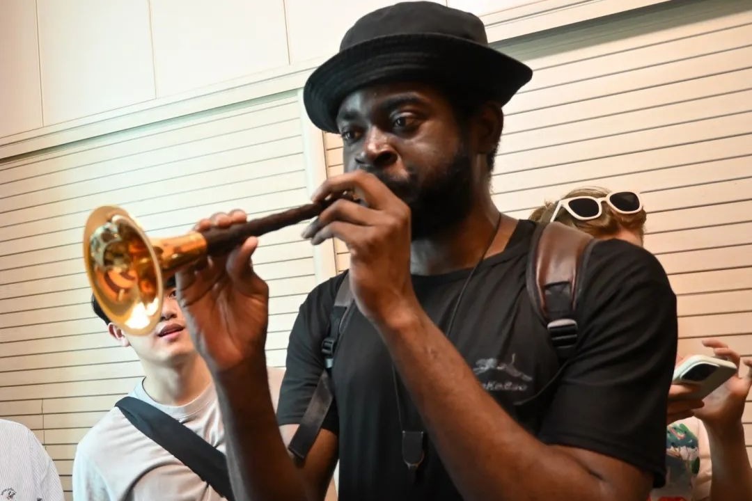 来自刚果的高水儿在唢呐传承人家中试吹唢呐