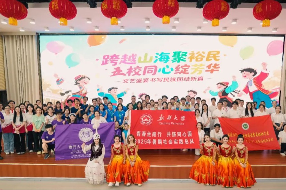 孟宪承书院沪浙港澳四校联合服务学习新疆支教实践团,将教育的触角延伸至祖国西北边陲。26名沪浙港澳学子在新疆塔城地区裕民县开展“裕见·星光”夏令营,围绕“知中国”“观世界”“见自己”三大主题,为130位孩子带来文化传承、国际视野与自我探索的多元体验。“与港澳同学并肩,看他们用粤语教孩子唱红歌,忽然懂了‘共绘民族团结’的深意。”第二次参与支教的张诚昊同学说。