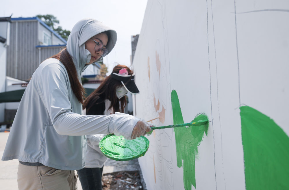 浙江农林大学暨阳学院设计专业的学生们创作墙绘,美化乡村人居环境。新华社发