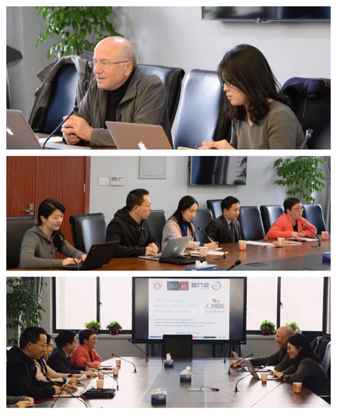 On March 1st, the workshop for the construction of JoRISS education platform was held in the Liberal Arts Building of East China Normal University. Professor Luc Trouche, coordinator of the cooperation project from IFÉ, Yang Fuyi, director of the International Affairs Division, Bai Yun, director of Instruction Affairs Division and some other staff and doctoral students attended the conference.