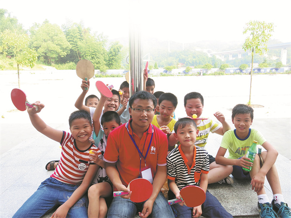 A volunteer teacher leads students in a ping-pong class at Fonian School in Weishan town, Liling, Hunan province, during the very first summer camp in 2014. [Photo provided to China Daily]