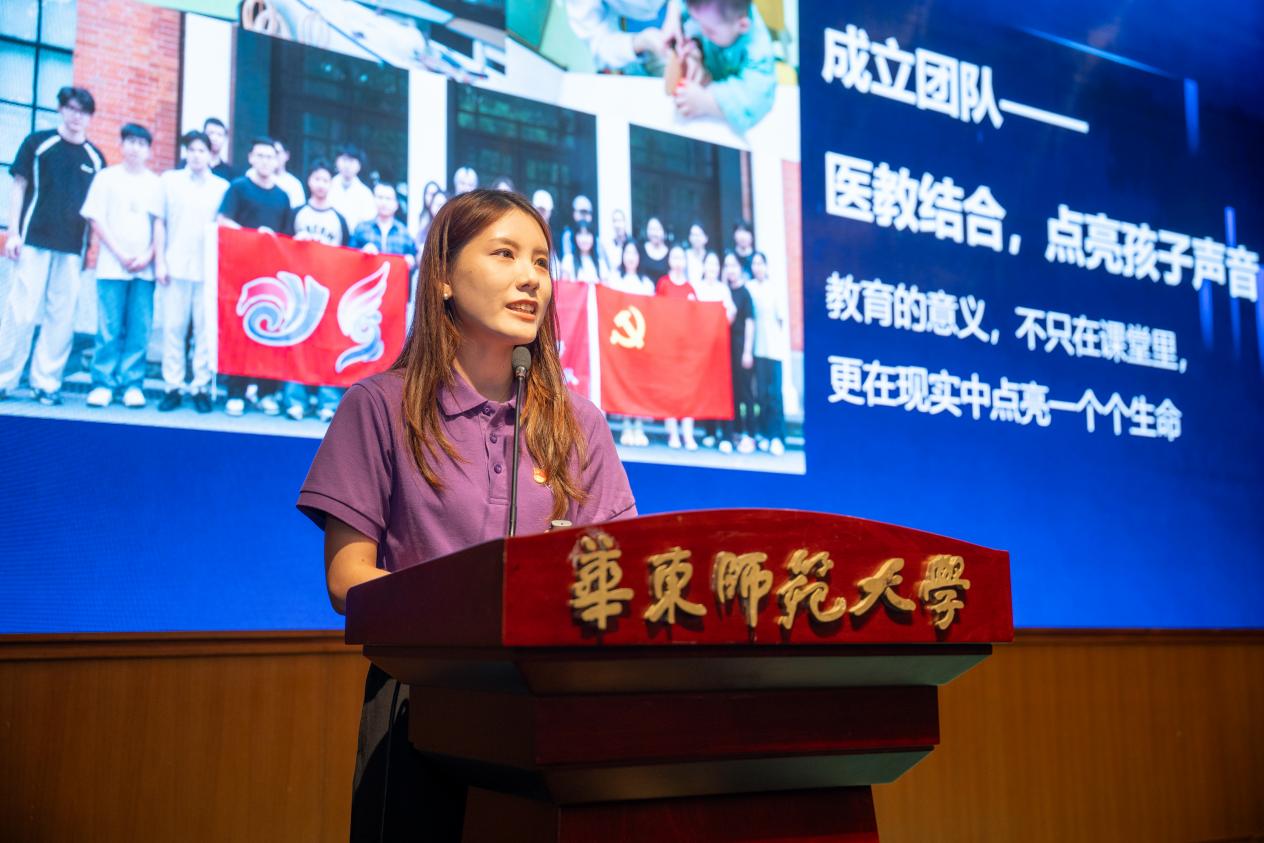 杨珊珊以“点亮”和“扎根”为关键词,讲述佛年爱心夏令营实践故事。作为志愿服务团队负责人,她发挥专业优势,多次主讲亲子阅读活动,累计服务超400个小时,号召新生党员筑牢专业根基、勇于实践、矢志奉献。