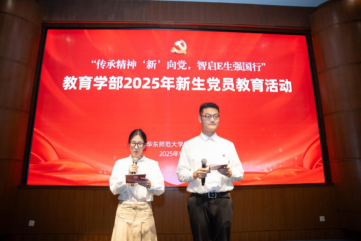 为深入学习贯彻党的二十大和二十届三中全会精神,全面落实全国教育大会部署及《教育强国建设规划纲要(2024—2035年)》要求,深化新生党员的责任担当,筑牢信仰之基、补足精神之钙,9月17日下午,教育学部党委在普陀校区逸夫楼报告厅,面向191名2025级新生党员举办“传承精神‘新’向党,智启E生强国行”教育活动。